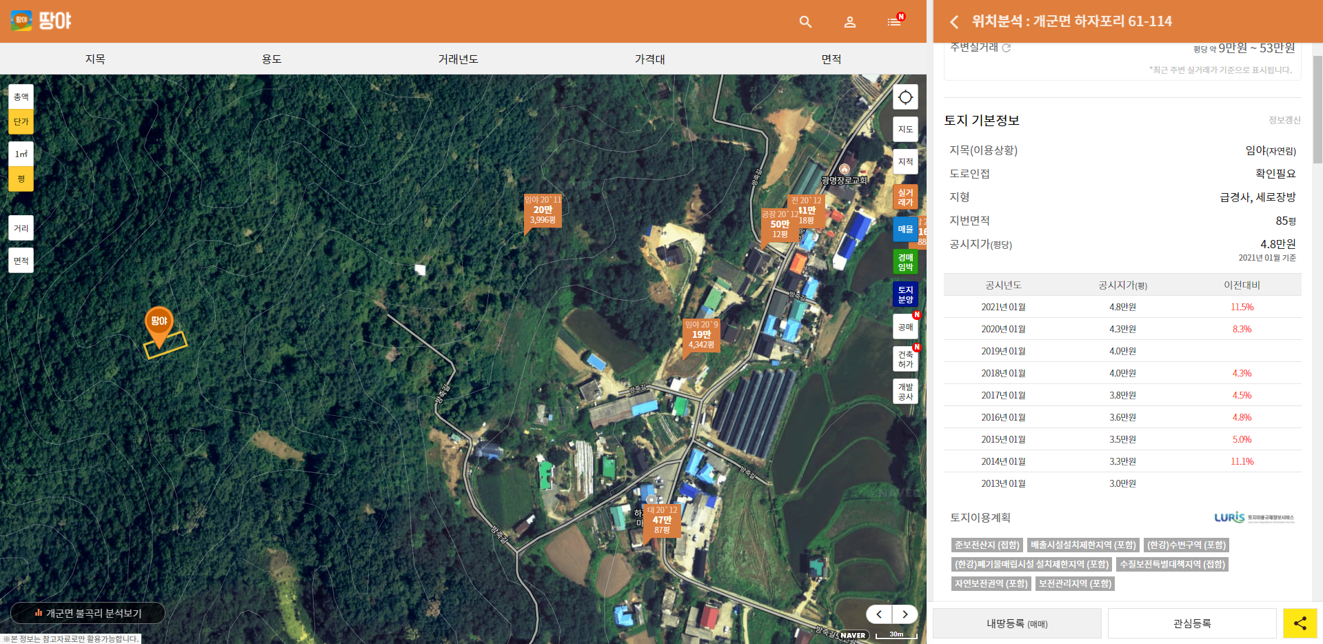 화면 우측에 새로운 탭이 나오면서 해당 토지에 대한 기본 정보들이 주르륵 나열된다. 지목, 지형, 면적, 공시지가와 같은 정보 외에도 토지지용계획도 표시된다. 일단 쭉 읽어보자.