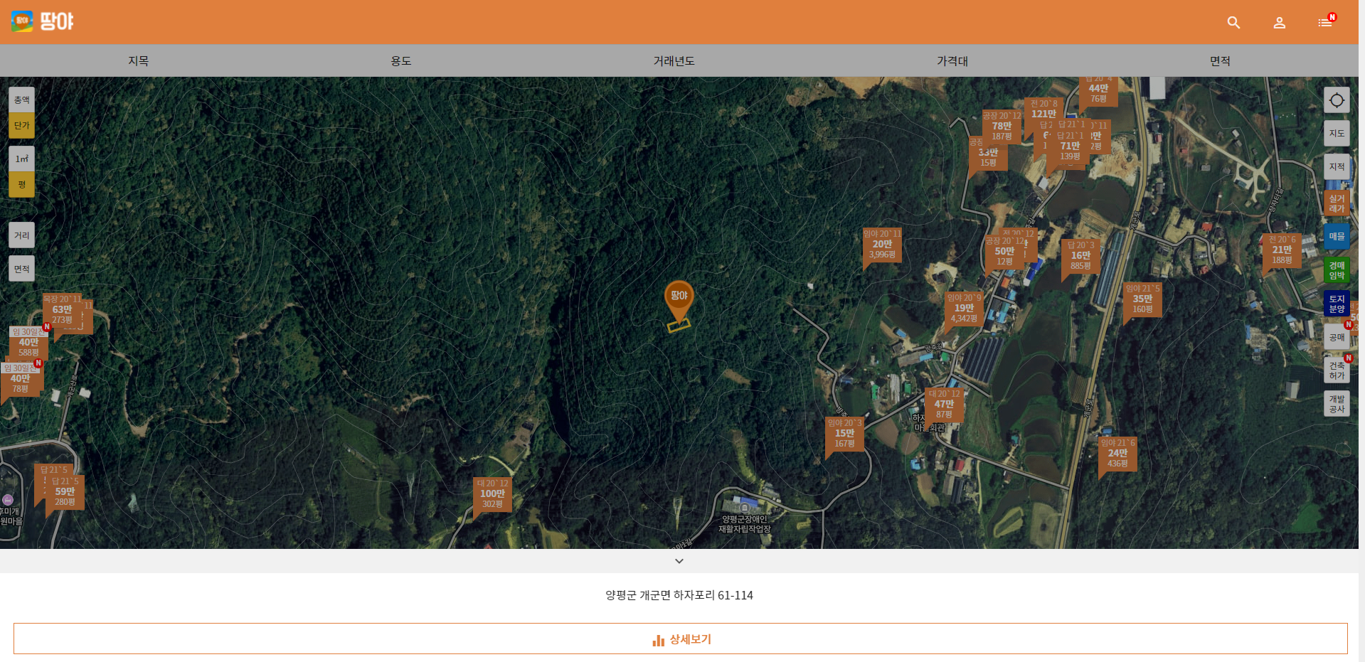 예를 들어 경기도 양평군 개군면 하자포리 61-114 라는 땅을 점찍었다고 치자. 땅야에 접속하면 아래 화면이 나오는데 우측 상단의 돋보기 모양을 클릭하자.
