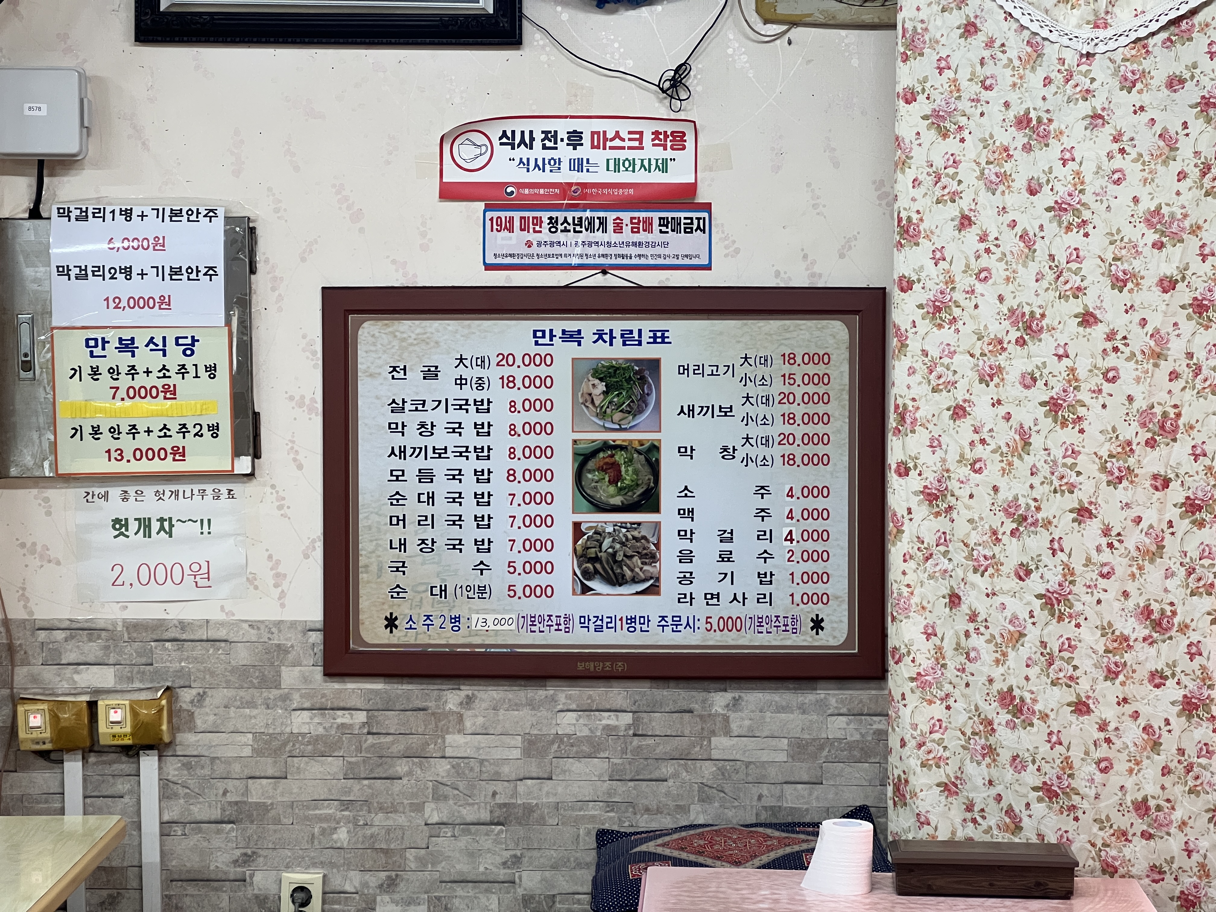 만복식당 차림표입니다. 국밥은 7천원이고 국수는 5천원 밖에 안 해요. 무지 저렴합니다.