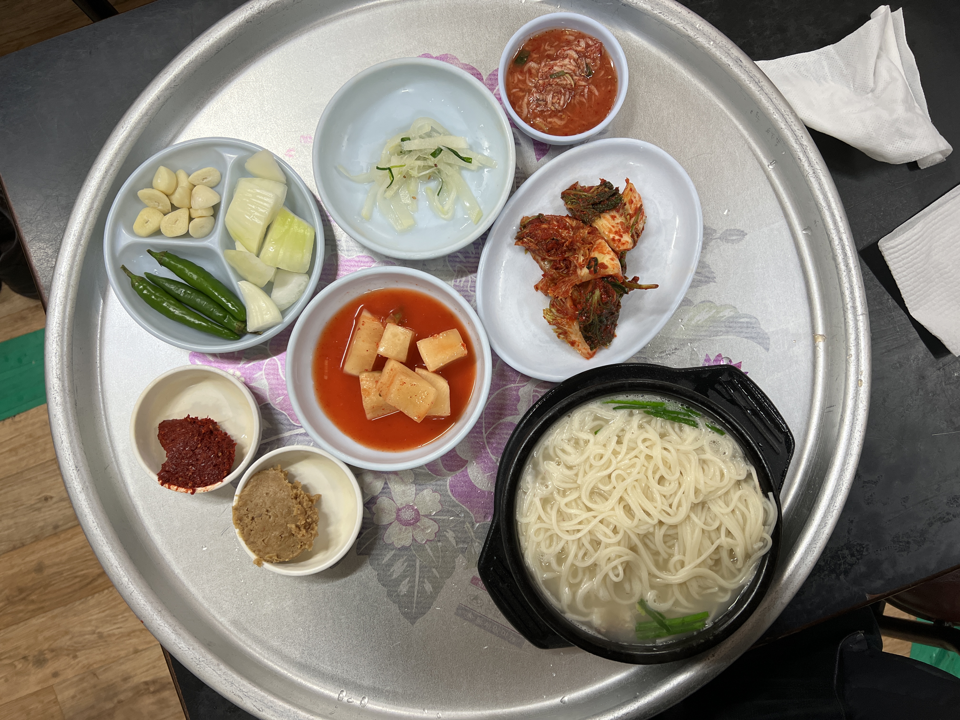 원래는 저 혼자 있었는데 메뉴를 시키고 갑자기 두 팀이 더 들어왔어요. TV를 보면서 기다리고 있는 동안 주문했던 국수가 나왔습니다. 와우! 국수면도 많고 반찬도 좋네요. 5천원 실화?
