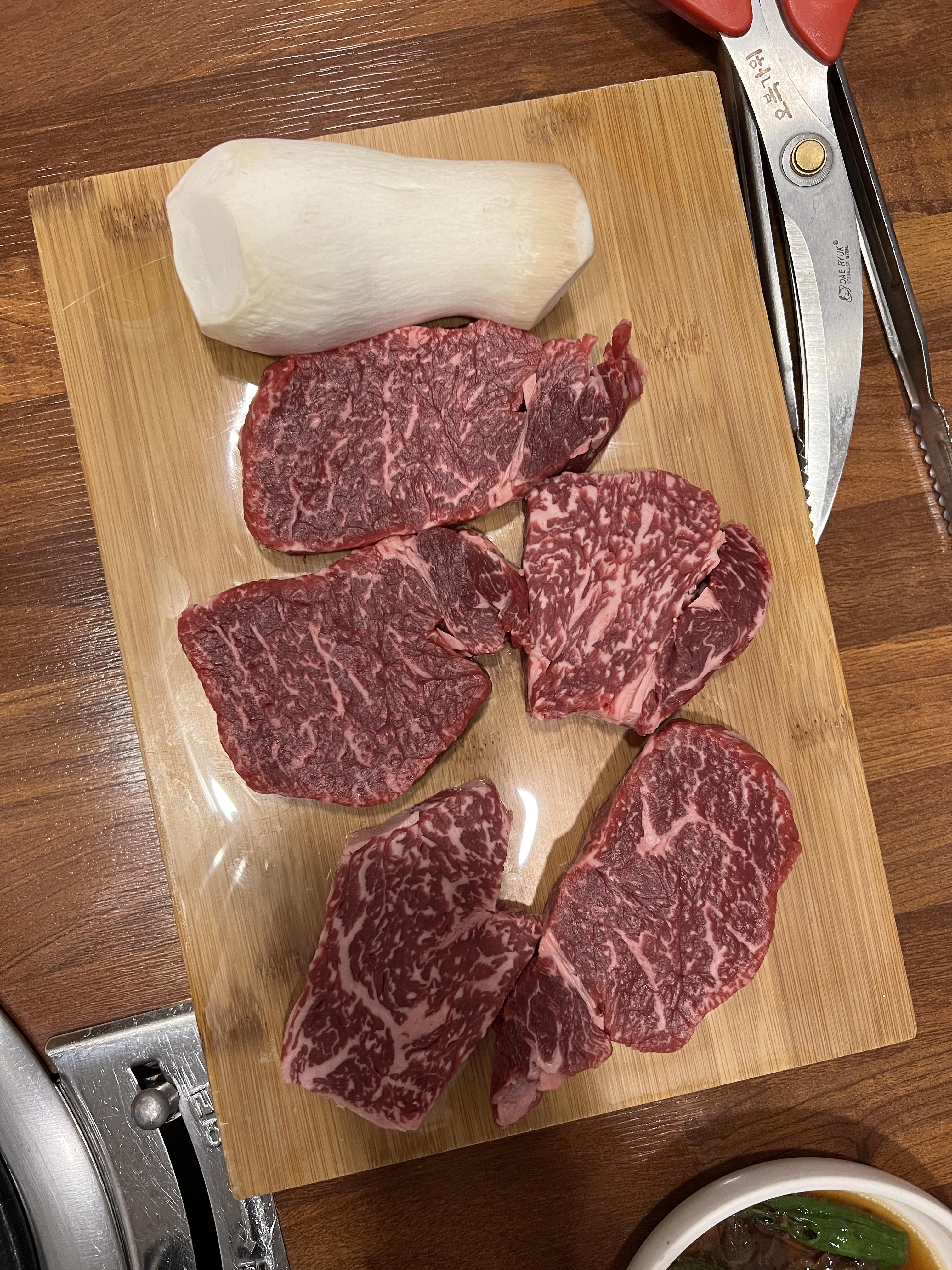 소고기가 나왔는데 비주얼이 끝내준다. 마블링도 좋고... 오늘 몸보신 제대로 하는구나!