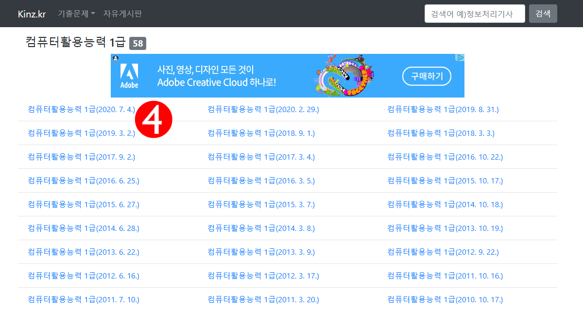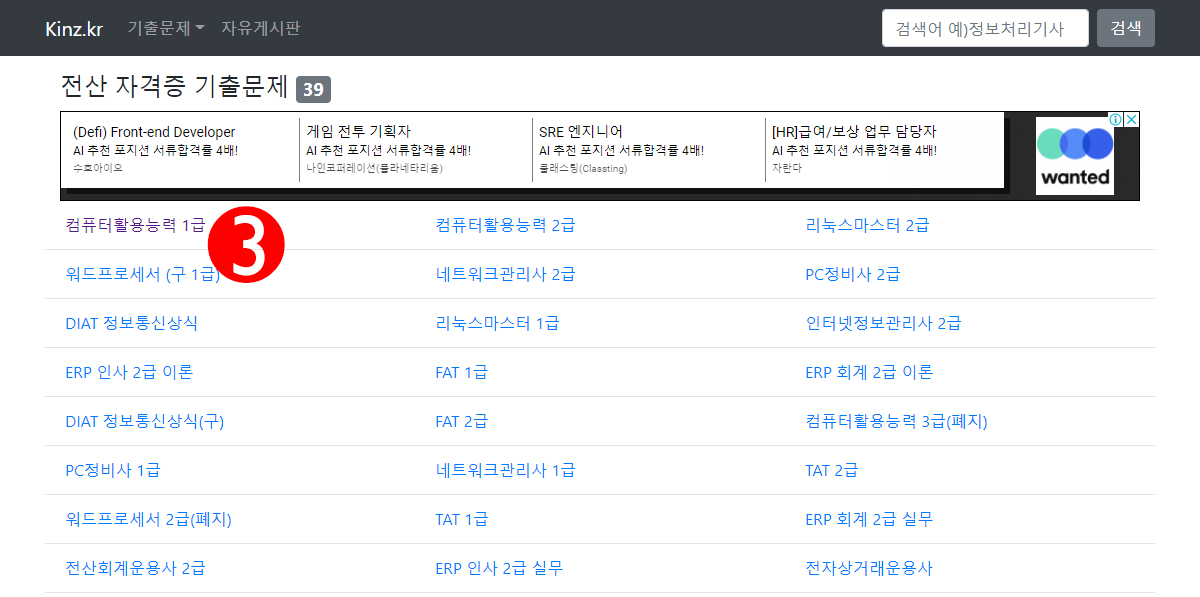 사이트 상단 기출문제를 누르면 공무원, 기사, 산업기사... 등 종별 기출문제 메뉴가 쭉 펼쳐진다. 전산 자격증을 클릭해보았다.