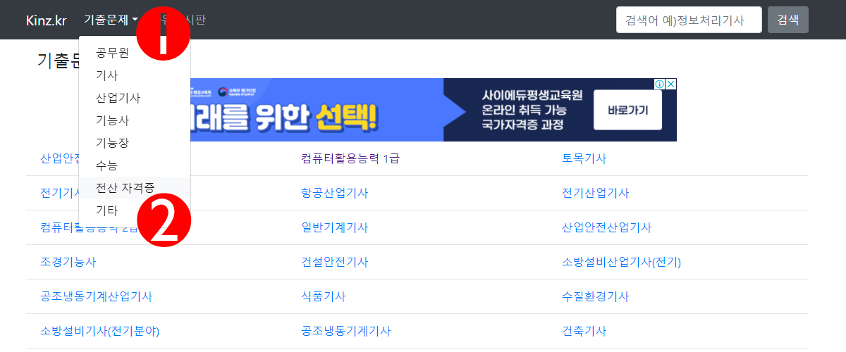 사이트 상단 기출문제를 누르면 공무원, 기사, 산업기사... 등 종별 기출문제 메뉴가 쭉 펼쳐진다. 전산 자격증을 클릭해보았다.