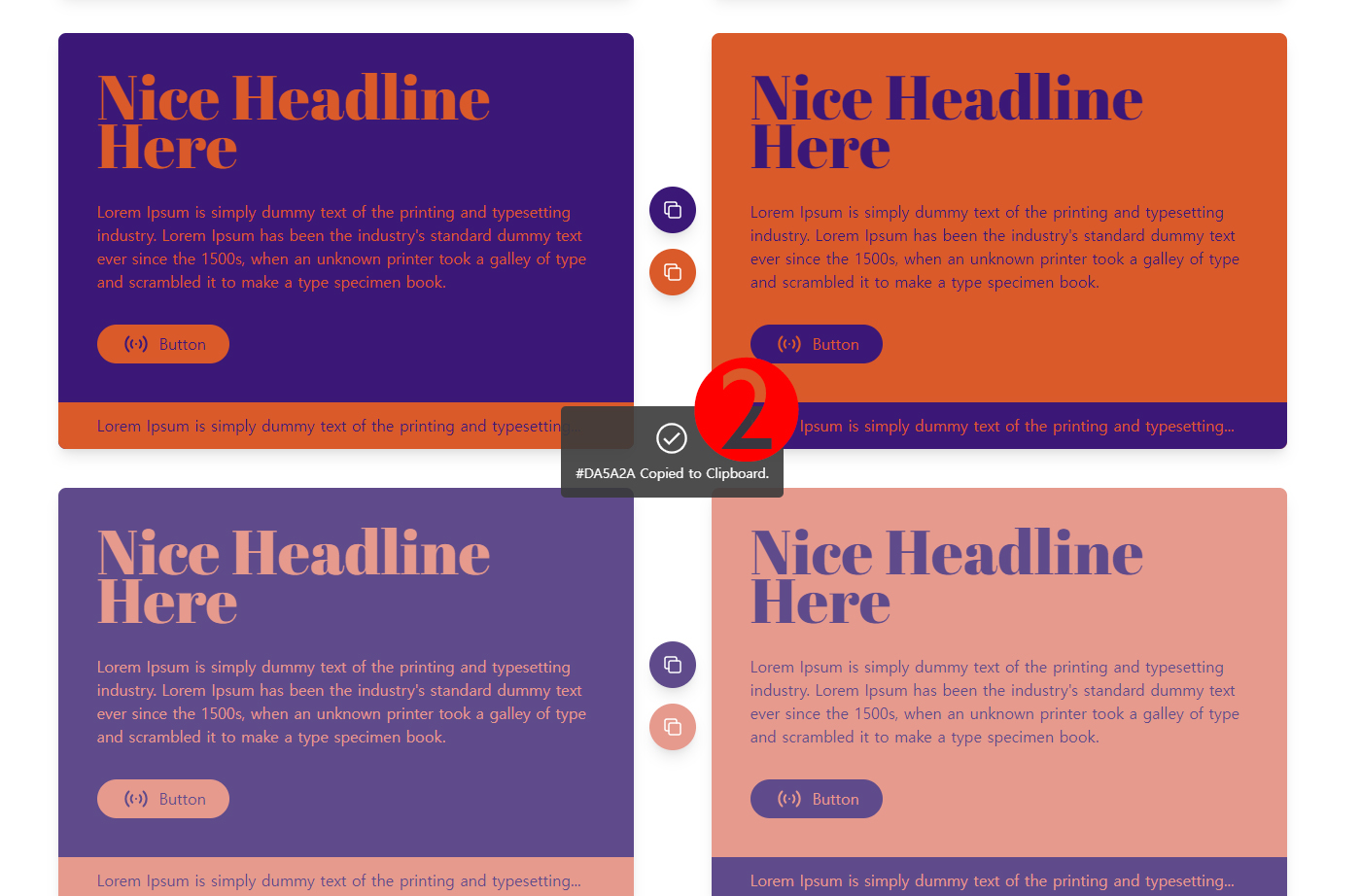 메뉴를 딱히 고를 필요도 없이 스크롤을 내리거나 올리면 여러 색상조합들을 볼 수 있다. 배너를 아무리 눌러도 색상코드가 보이지 않아 고민이라고? 1번의 작은 버튼을 클릭해보자.