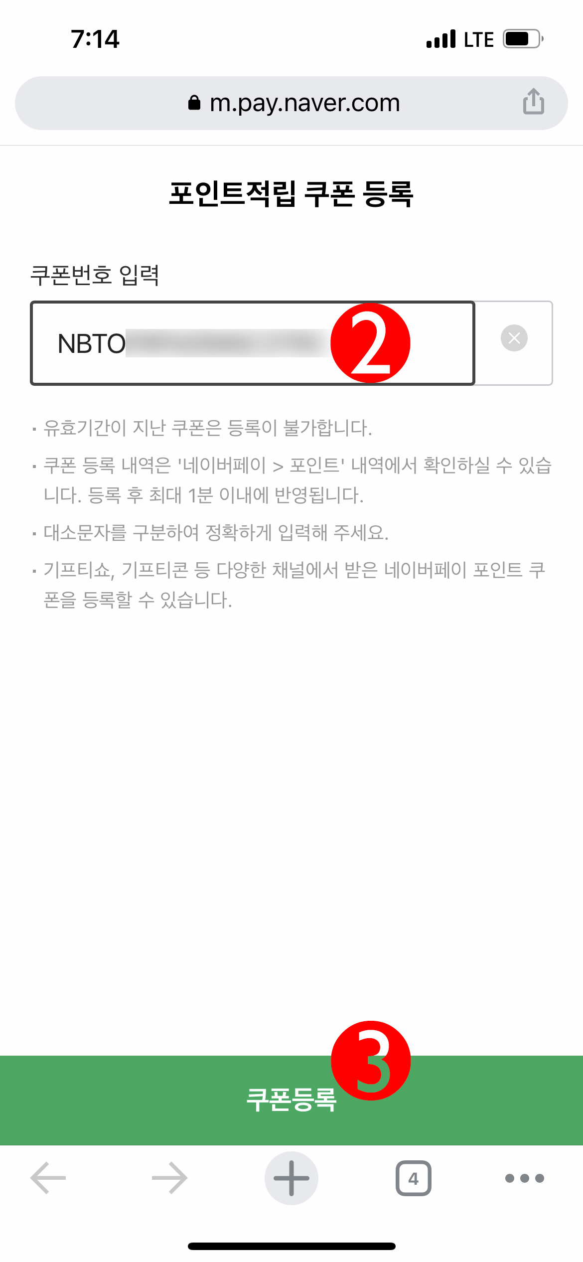 아래 1번에 보이는 것처럼 문자메시지가 온다. 1번의 URL을 클릭하고 아래 두번째 화면이 나오면 2번에 쿠폰번호를 입력한 다음 3번 쿠폰등록 버튼을 누르자. 그러면 세번째 화면에 보이는 것처럼 '등록이 완료되었습니다'라는 안내메시지가 나온다. 성공이다.