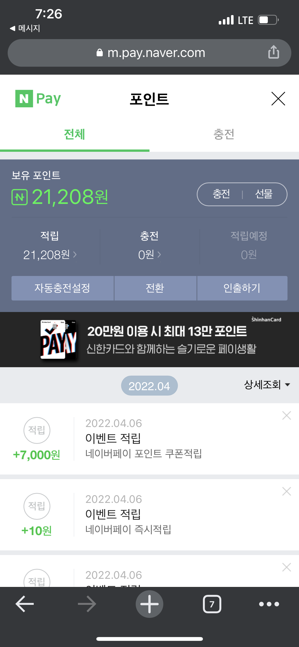 자동차보험 기간 만료 기한이 다가와 새로 자동차보험을 알아보다가 아주 좋은 정보를 발견했다. 네이버 페이 혜택 코너에 있는 몇개 보험사에서 자동차 보험료를 조회하기만 해도 네이버 페이 7천 포인트(현금 7천원과 동일)를 증정하고 있었다. 이렇게 좋은 꿀정보를 그냥 지나칠 수 없었다. 나도 3개 보험사에서 7천 포인트씩 받아서 총 2만 1천을 벌었다. 10분 투자하고 2만 1천원이라니! 솔솔하다.