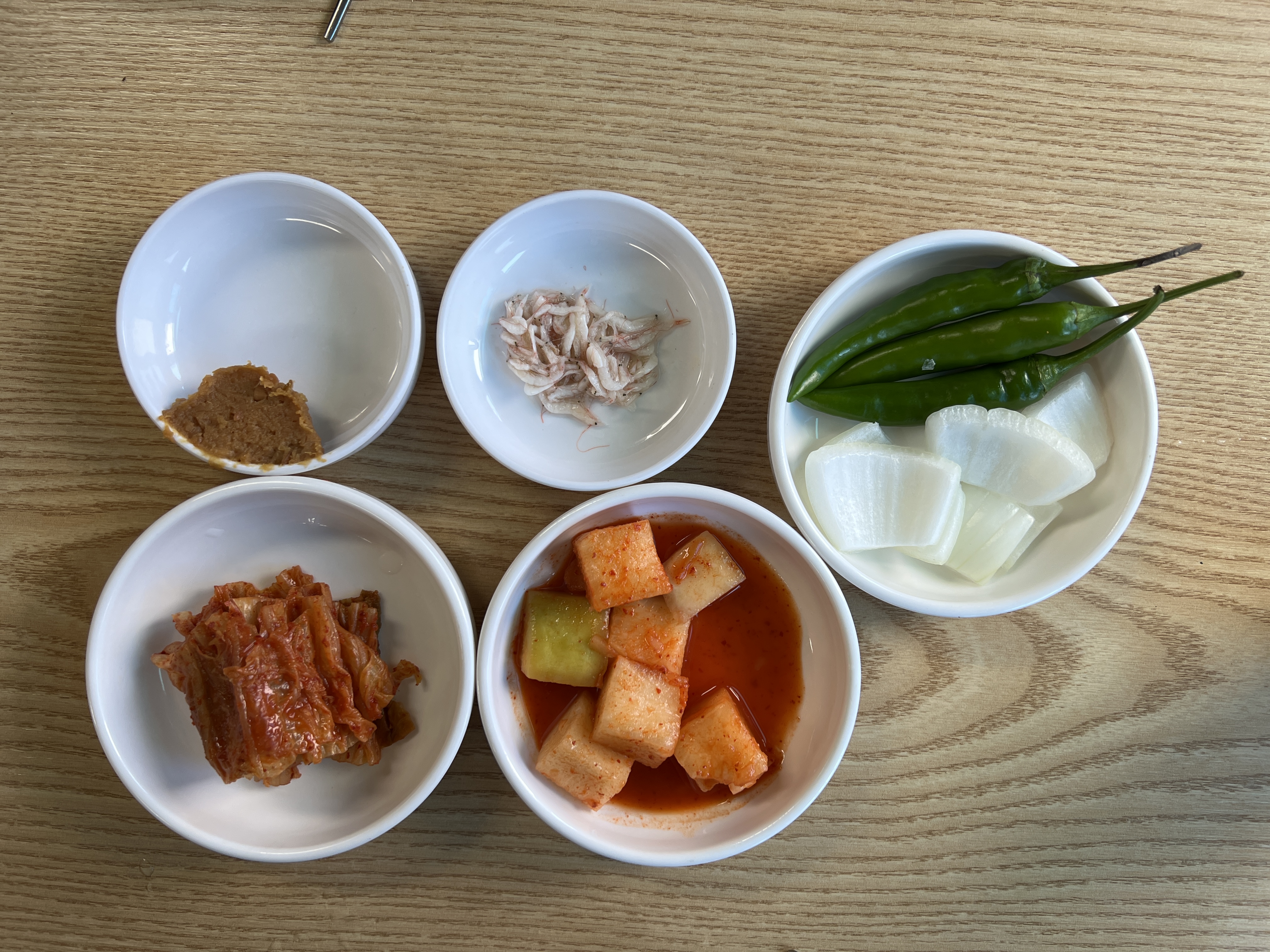 찬과 양념은 아래와 같다. 새우젓, 배추김치, 깍두기, 고추, 양파, 된장, 들깨가루, 매운양념이다.