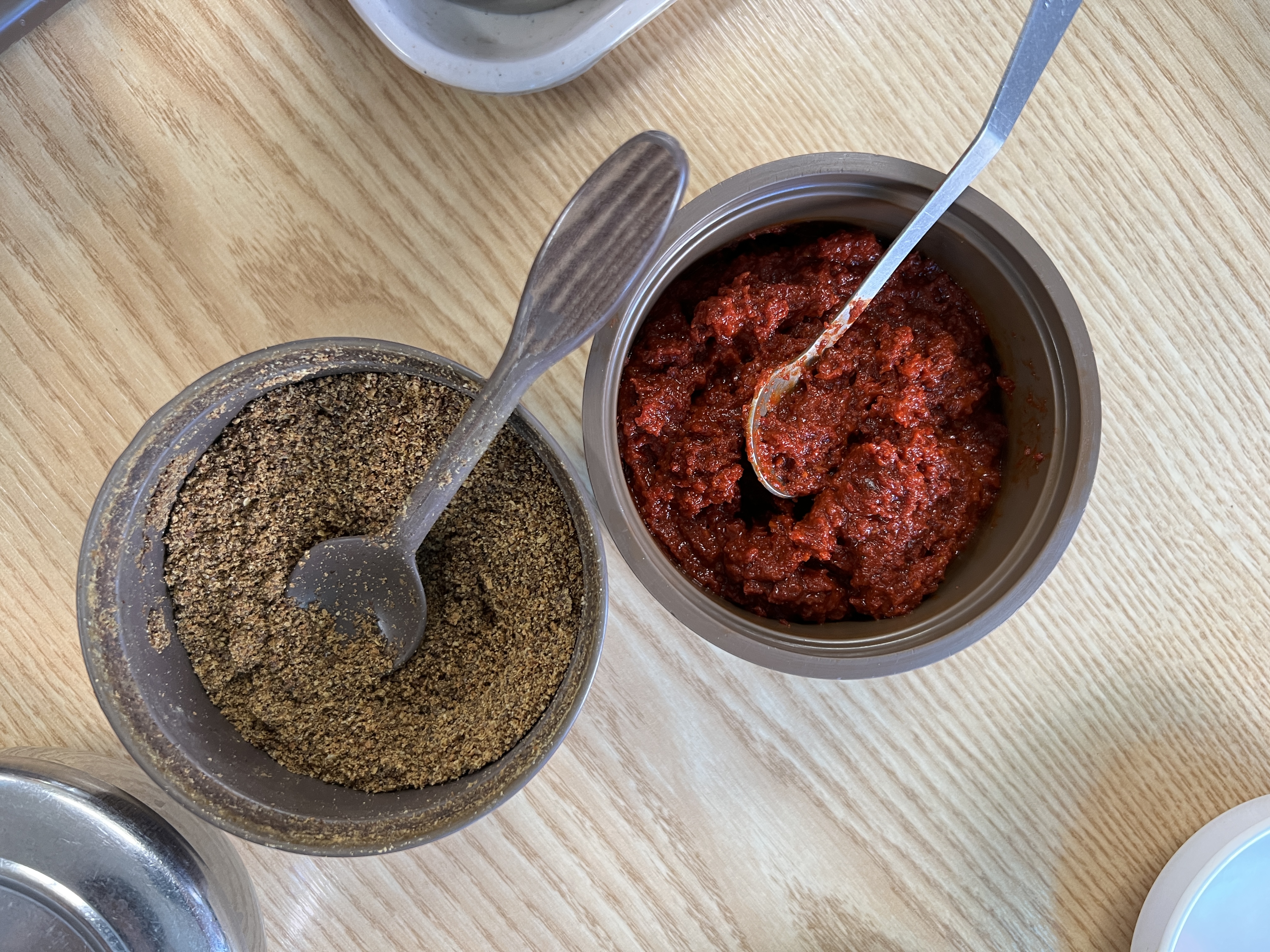 찬과 양념은 아래와 같다. 새우젓, 배추김치, 깍두기, 고추, 양파, 된장, 들깨가루, 매운양념이다.