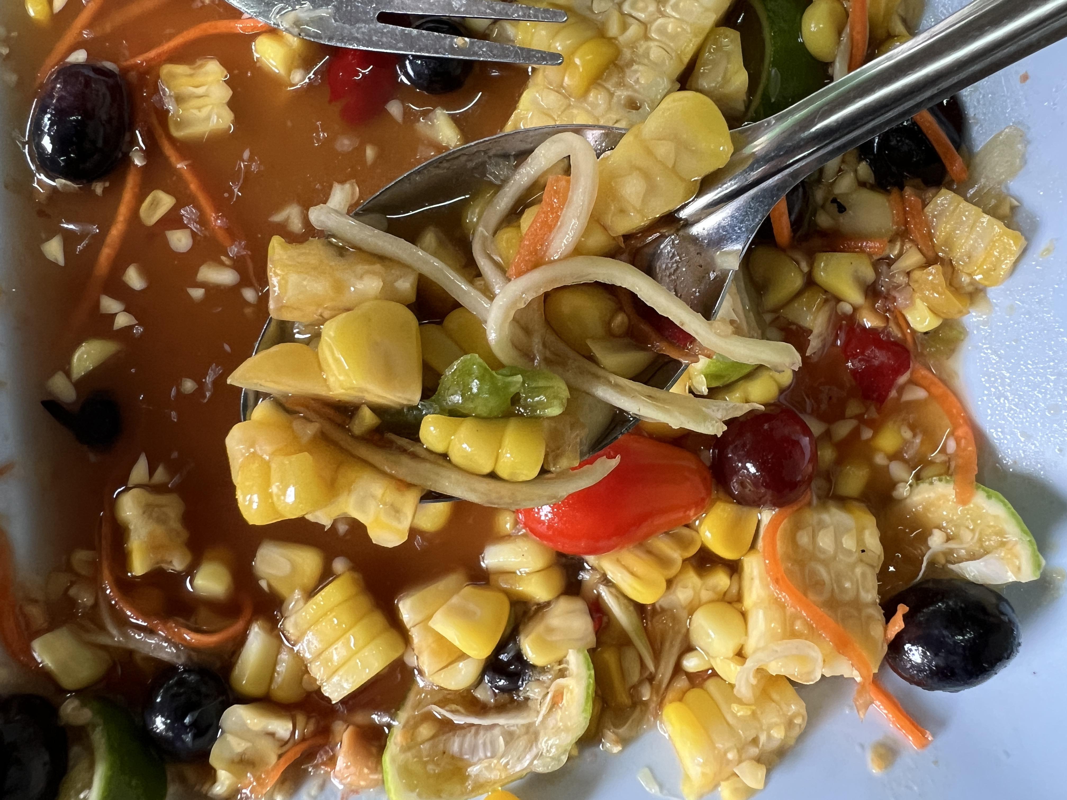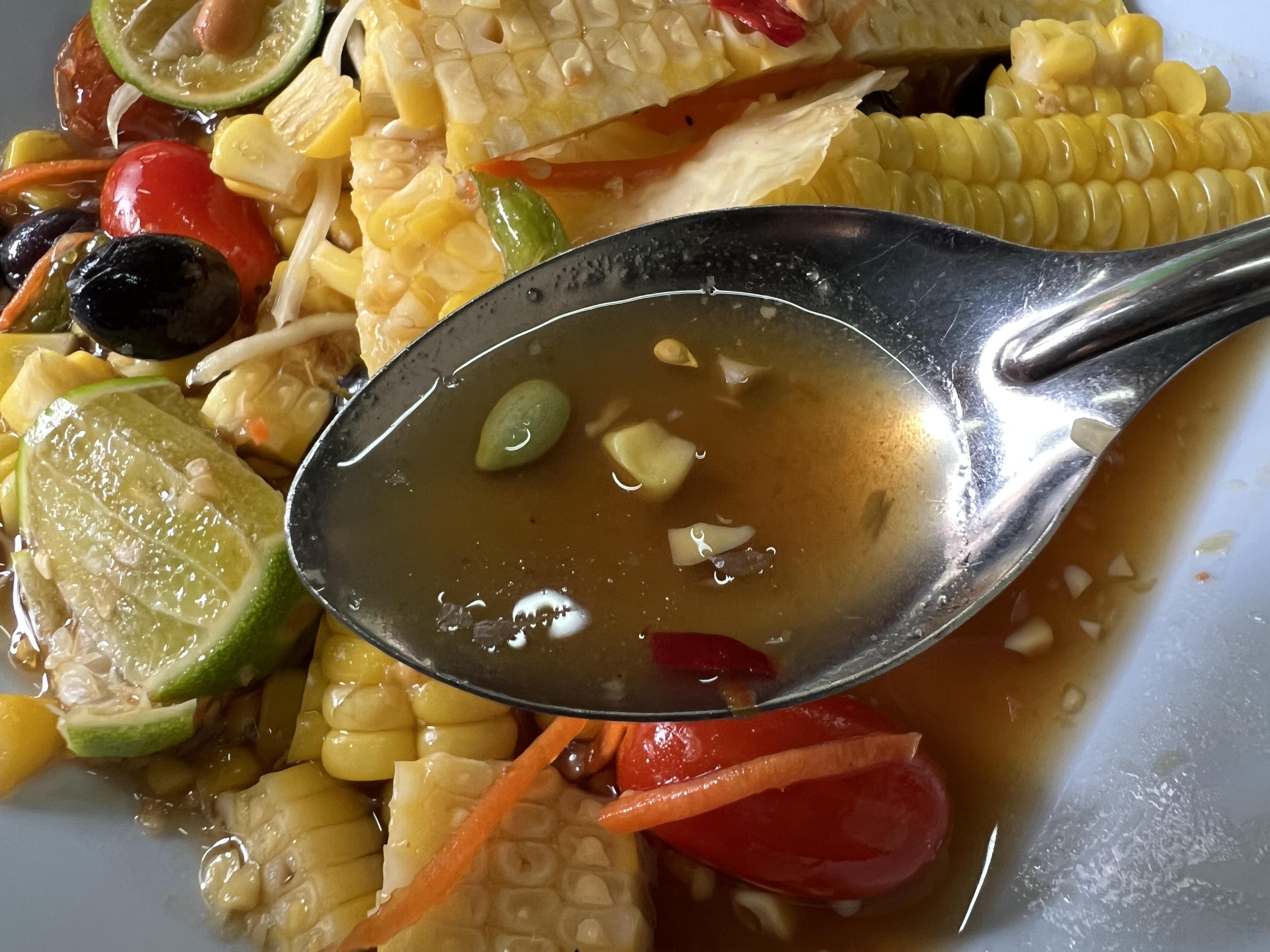 삶은 옥수수가 통으로 들어가 있는데 달콤하고 새콤한 맛이 끝내준다. 태국 요리에 들어가는 소스를 극혐하는 나였는데 이 소스는 정말 쪽쪽 빨아먹을 정도로 맛있다. 포도처럼 생긴 과일도 들어가고 토마토도 들어가 있었다.