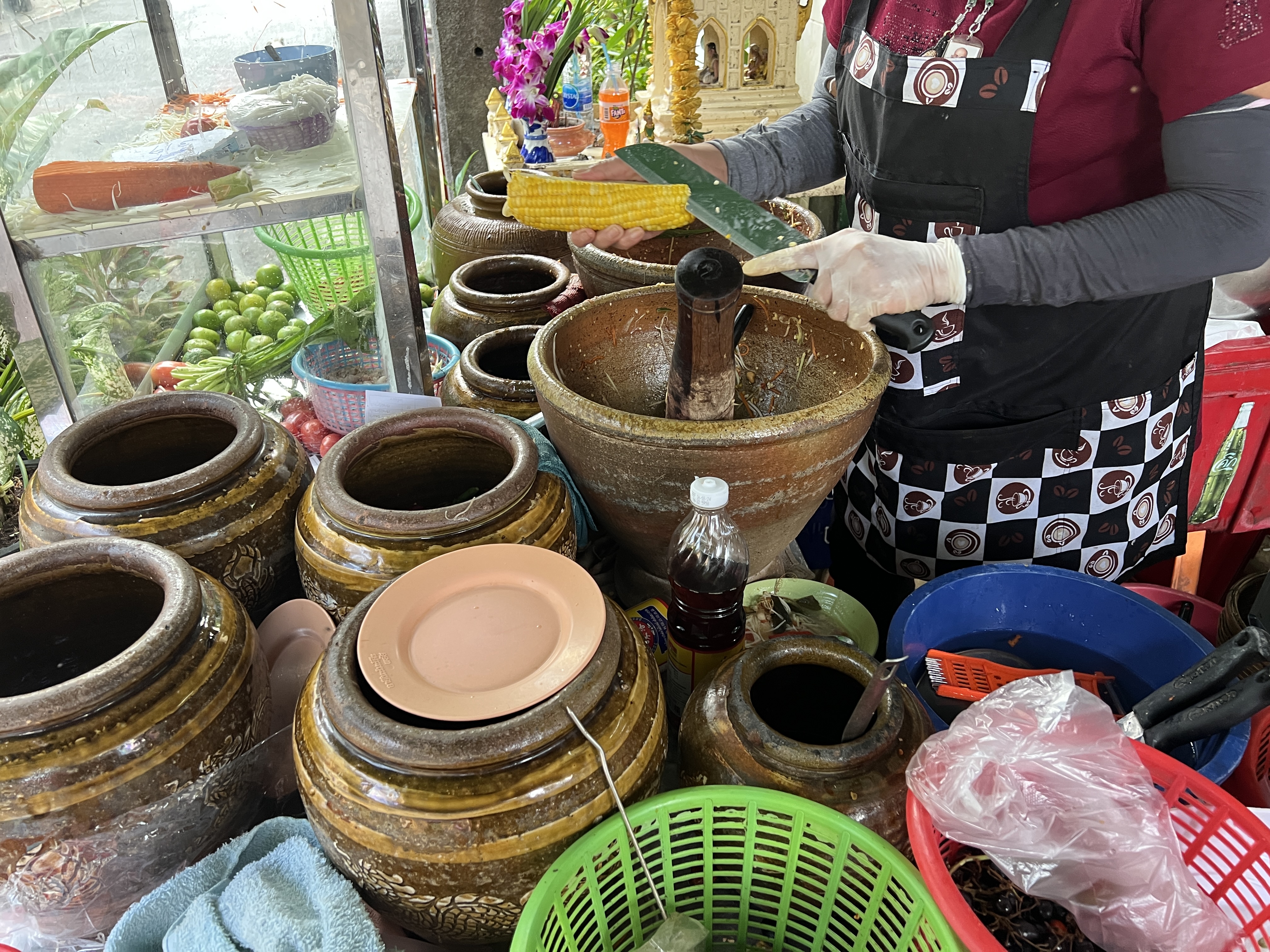 나는 옥수수쏨땀과 닭날개구이를 시켰다. 주문하고 오픈키친(?)으로 가서 만드는 모습을 담아본다. 아이 재밌엉!