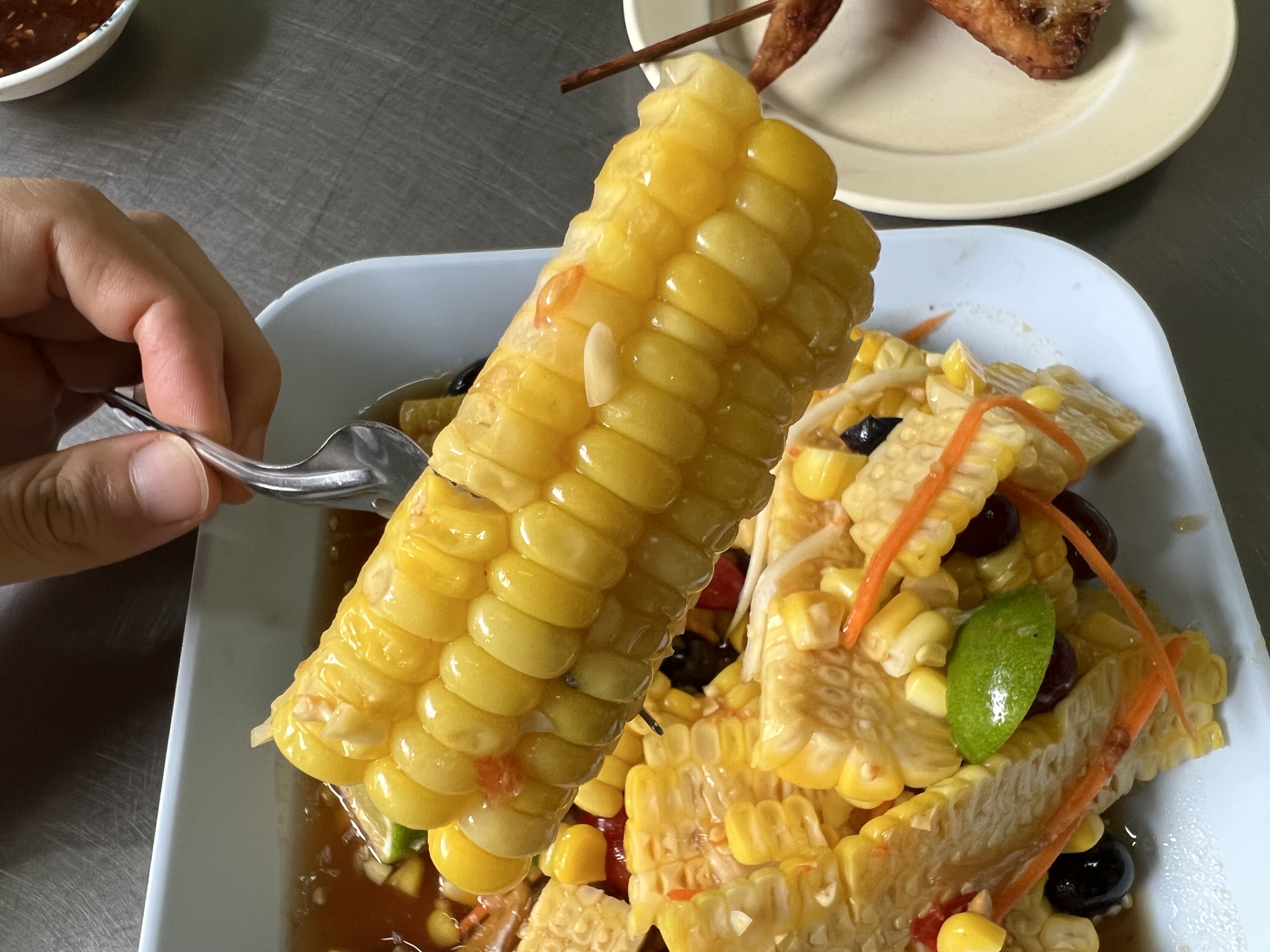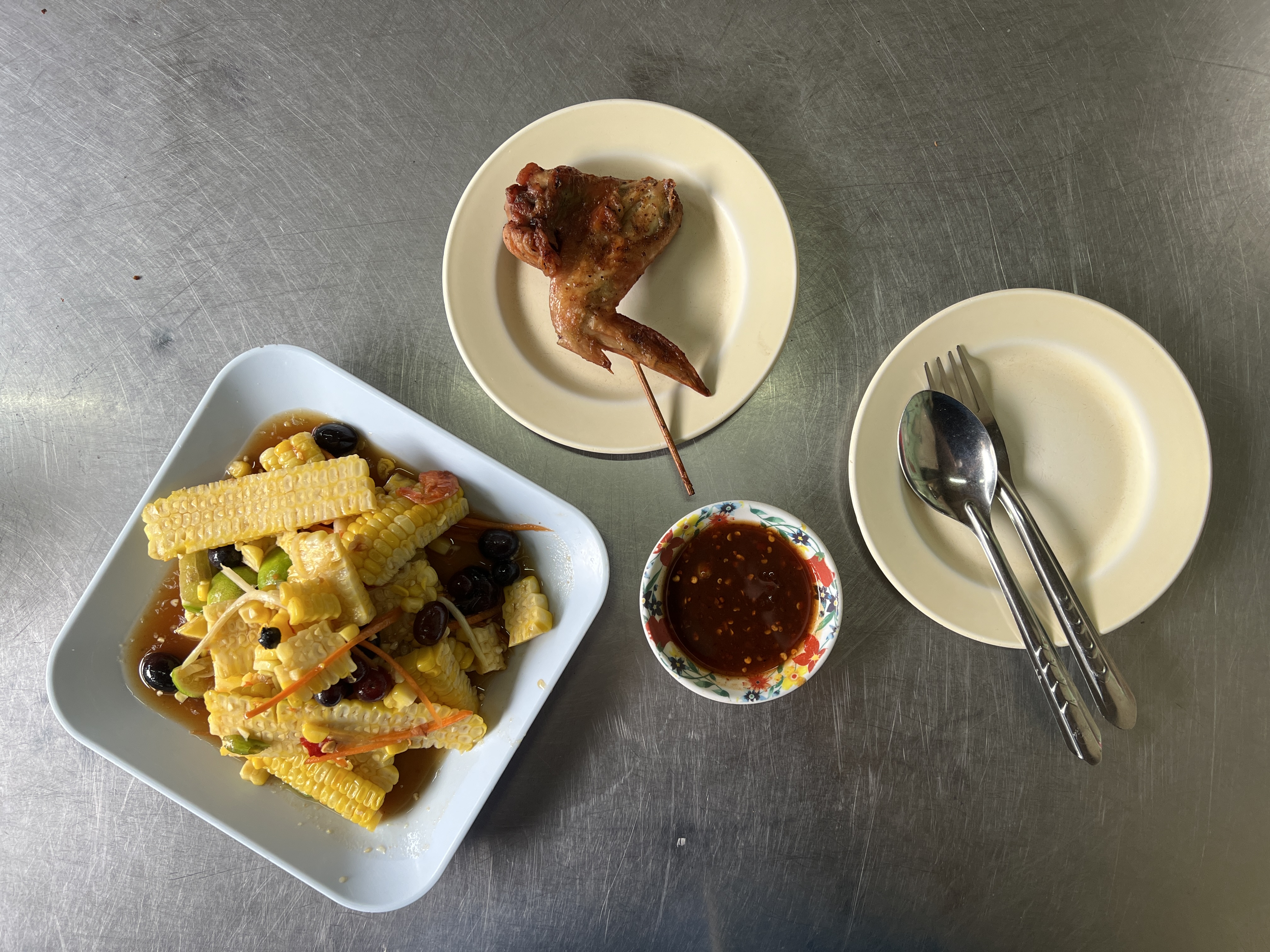 옥수수쏨땀과 닭날개구이가 나왔다. 홀리~ 옥수수쏨땀 비주얼이 끝내준다.