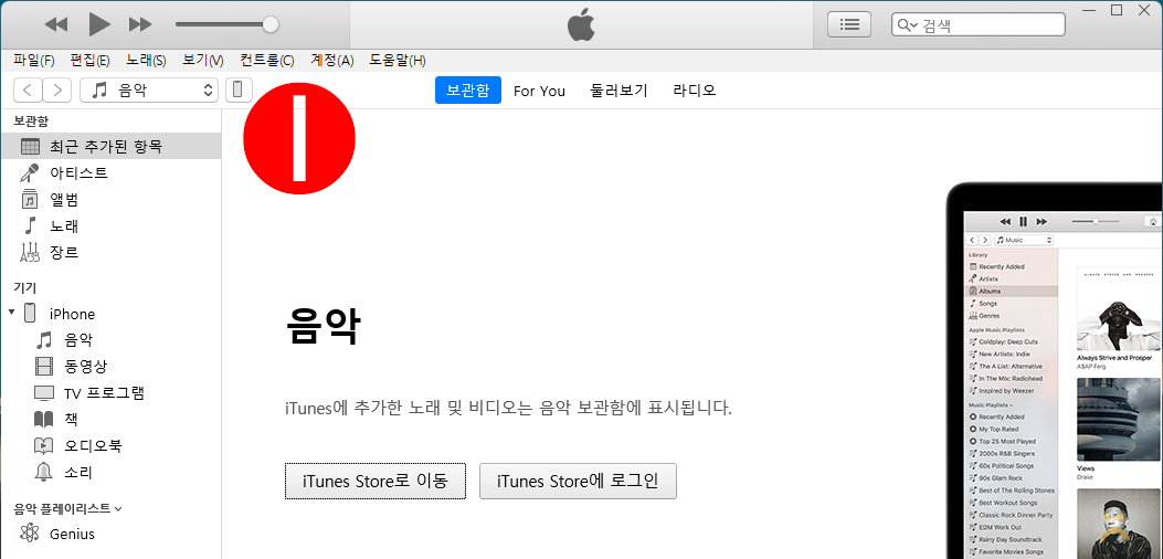 아이튠즈를 열고 1번의 아이폰 모양 아이콘을 누른다.