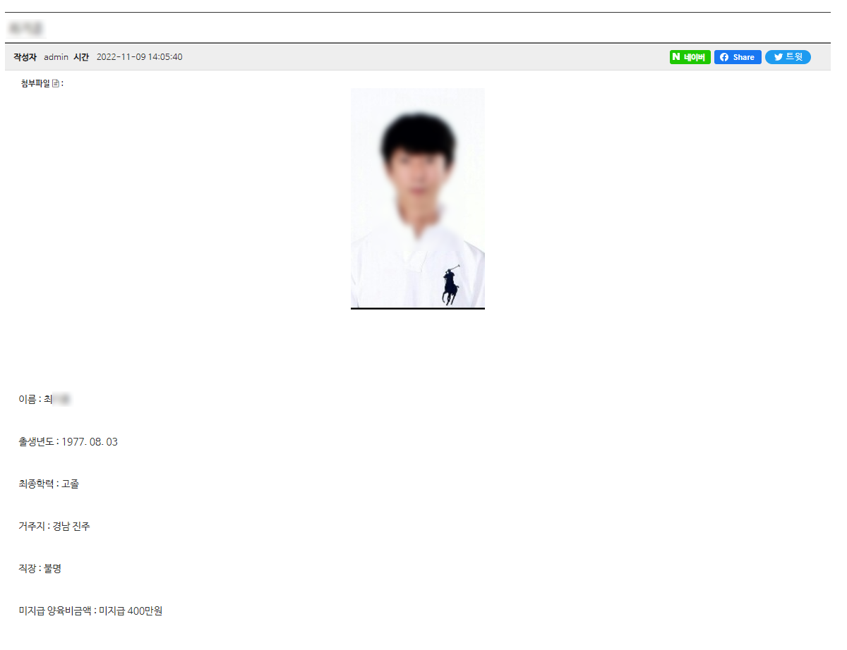 무작위로 클릭해본 화면이다. 양육비를 지급하거나 지급하기로 한 것이 확인되면 리스트에서 삭제한다고 한다. 일종의 양육비 지급을 강제하기 위한 사이트라고 봐도 되겠다.