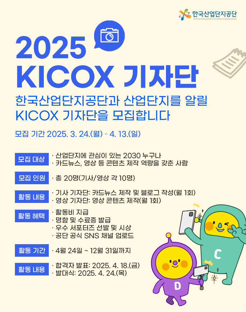 2025년 3월! 한국산업단지공단과 산업단지를 알릴 2025 KICOX 기자단을 다음과 같이 모집합니다.🙌 ...