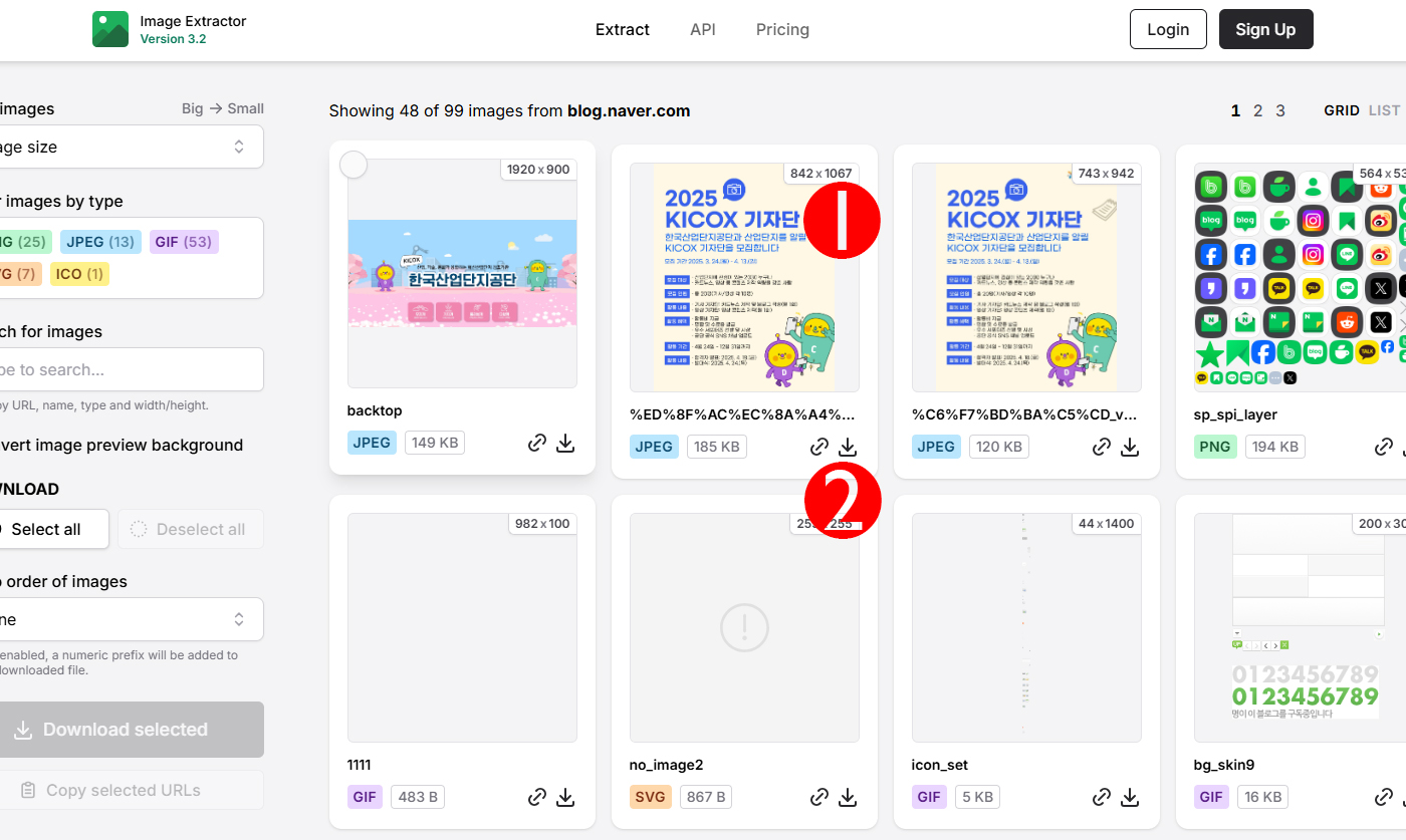 짠! 해당 페이지에 있는 거의 모든 이미지들이 추출됐습니다. 저는 모집공고 이미지를 다운로드 할 계획인데 되도록 해상도가 큰 이미지가 화질이 좋겠지요? 1번의 해상도를 확인하고 2번의 다운로드 버튼을 누릅니다.
