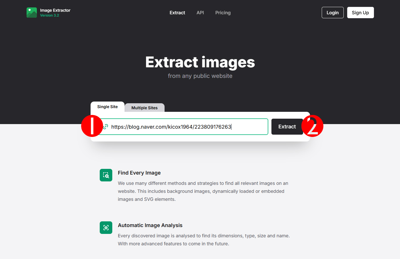 사이트에 접속하면 아래와 같은 화면이 나와요. 1번에 다운로드 하려는 이미지/사진이 있는 블로그 글 주소(URL)을 입력하고 2번 추출(Extract) 버튼을 누릅니다.