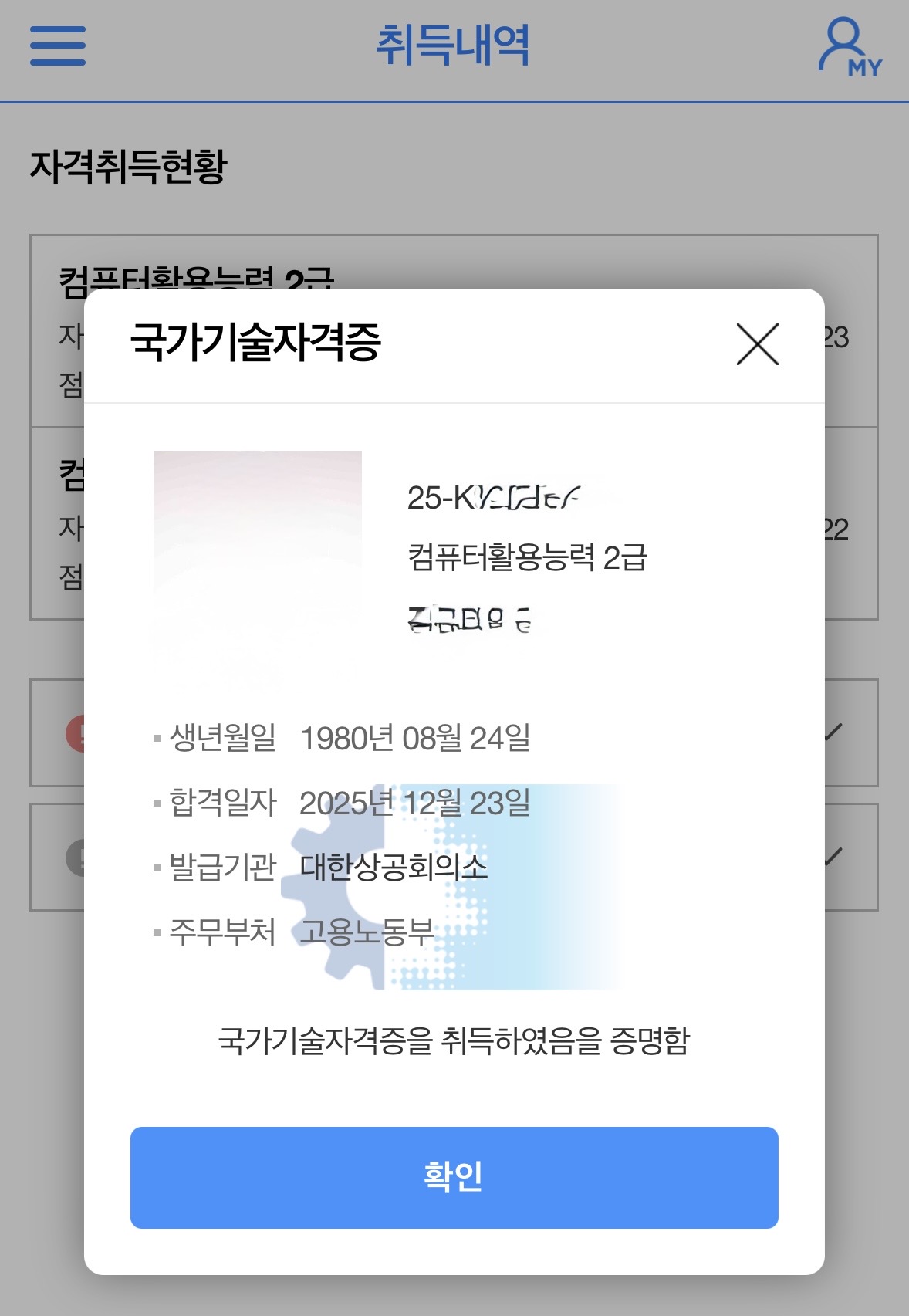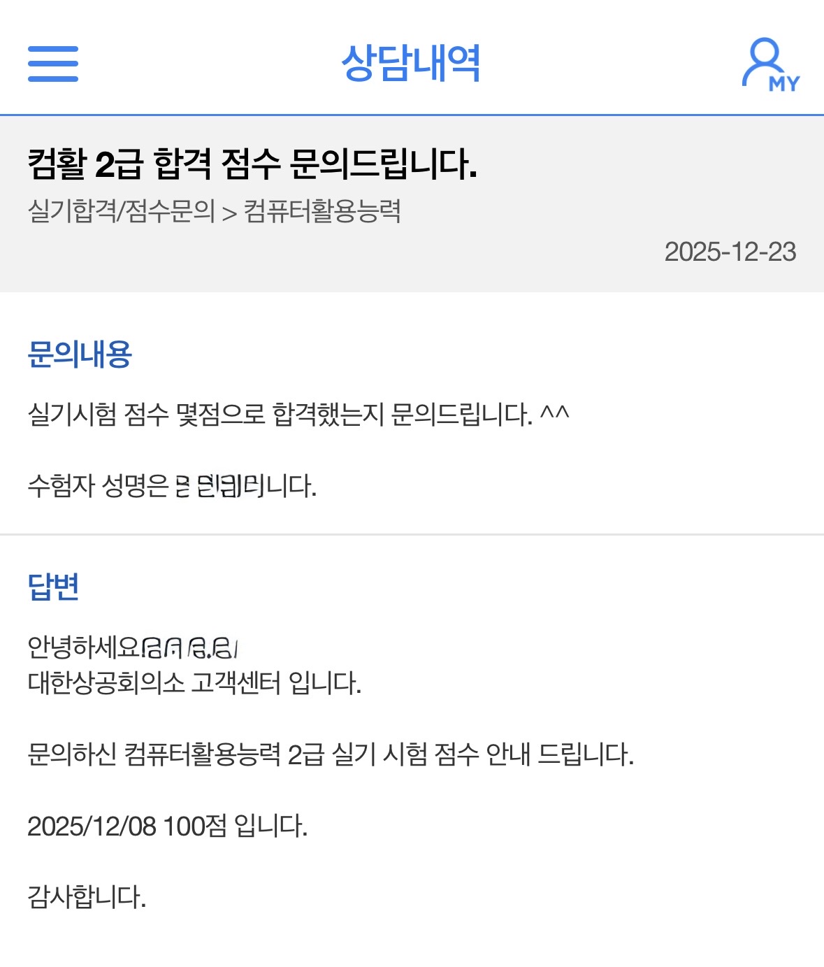 드디어 컴퓨터활용능력시험 2급 자격증을 땄다. 먼저 합격 인증샷부터 보자.