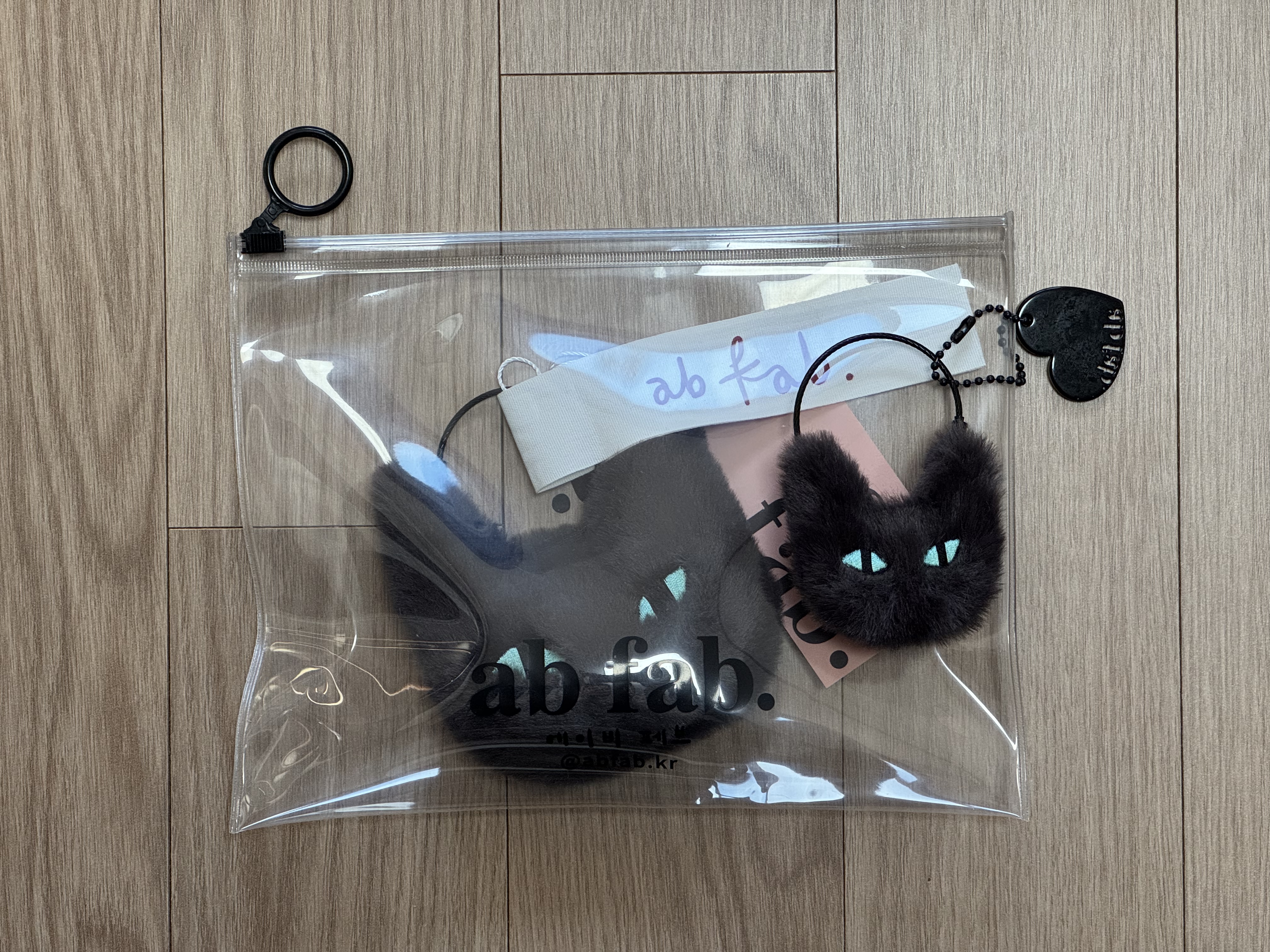 포장을 뜯은 모습은 아래와 같다. 털이 무척 부드럽고 만지면 기분이 좋아진다. 와이어는 검정색인데 약간의 코팅을 두른 모습이었다. 검정색 하트 장식이 달려 있는데 이거 생각보다 귀엽다. 다른 색이었으면 달고 다니기 부담스러웠을 텐데 요 키링하고는 참 잘 어울린다.