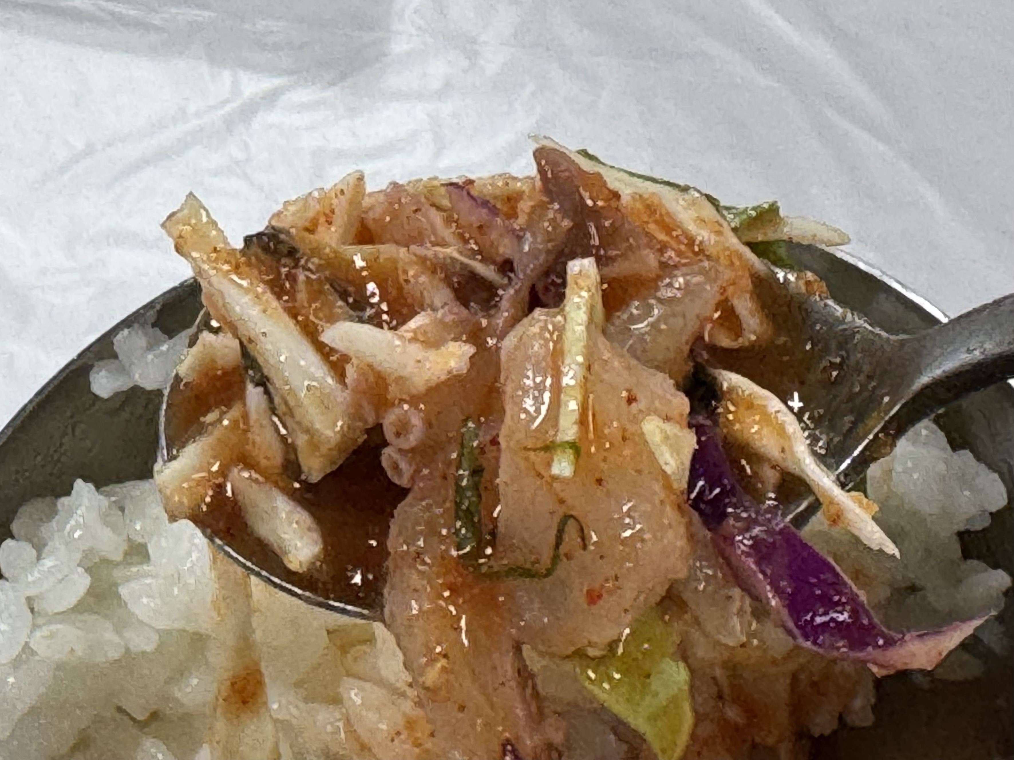 반찬 중에 가장 맛있었던 회무침.. 이거 진짜 밥도둑이었다. 하긴 저 비주얼에 맛없기도 힘들테지. 아쉬운 점은 세점 정도 밖에 없다는 거. 여친이 나보다 동생이라 마지막 한개는 양심상 남겨둔다. ㅋㅋㅋ