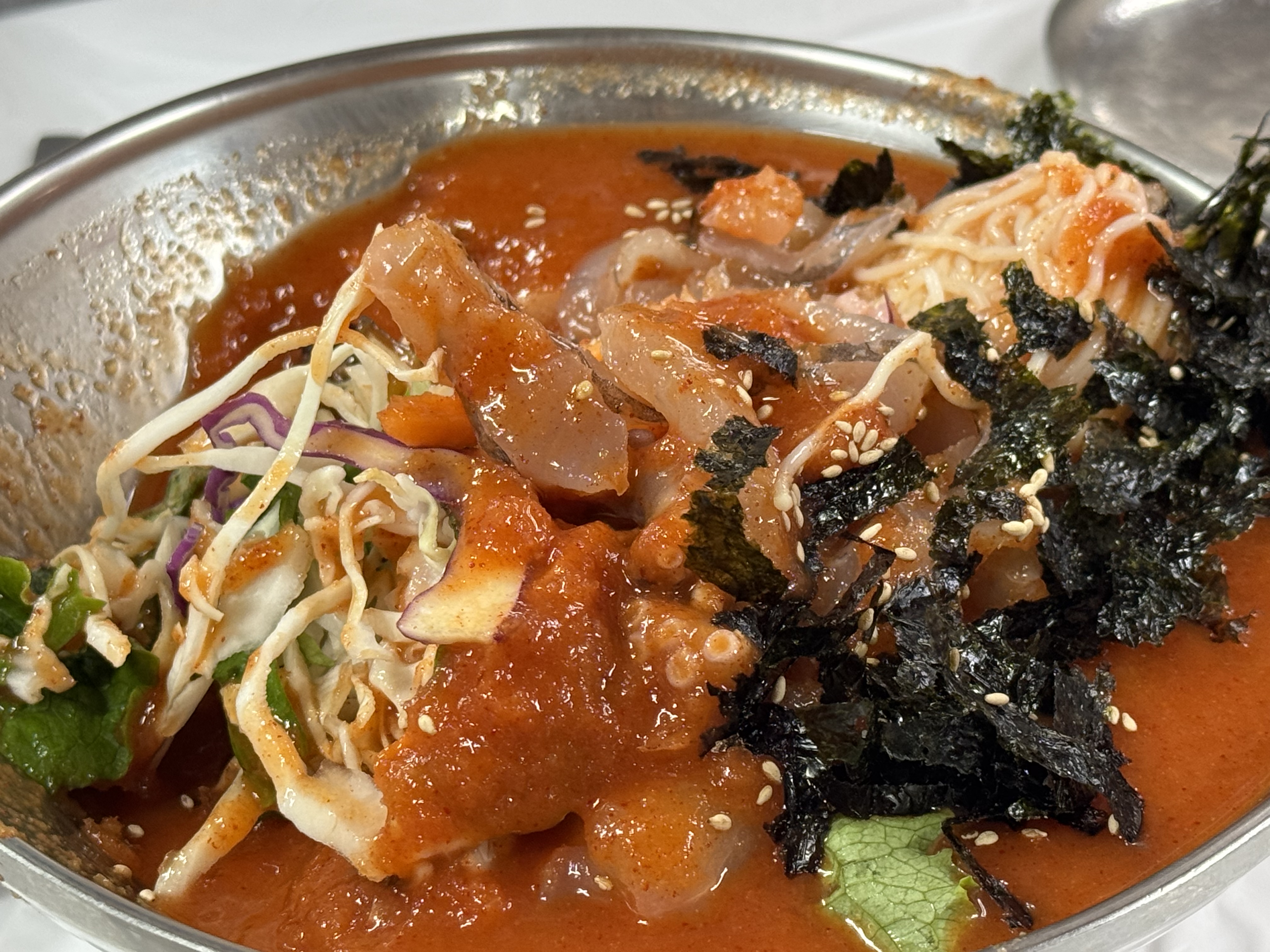 물회와 회덮밥이 생각보다 빨리 나왔다. 가자미? 홍어? 무침도 나오고 특히 저 김국이 참 맛났다. 비주얼은 미역국 또는 매생이국이랑 비슷한데 김국이라고 한다.