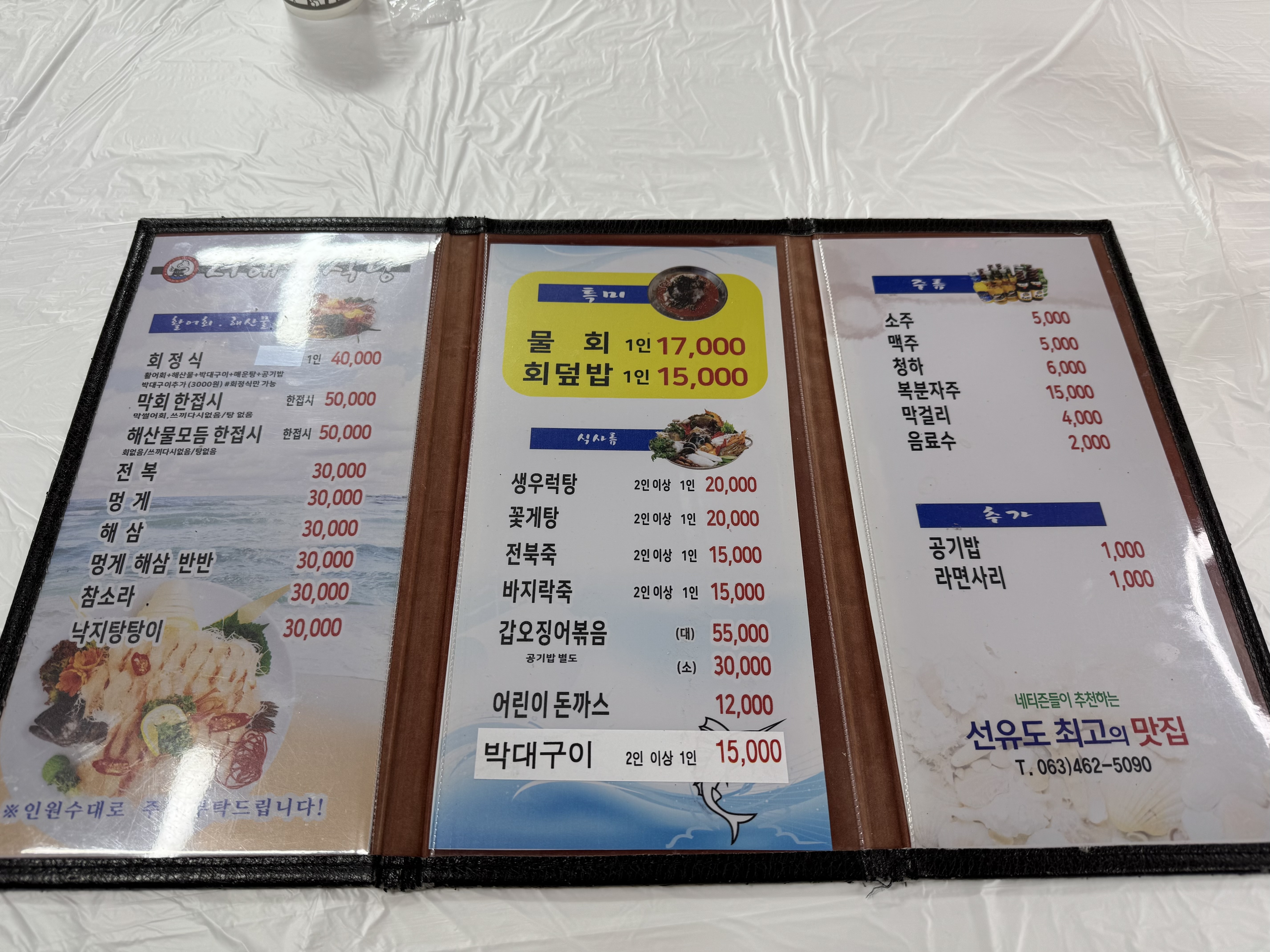 식당 앞에 도착하자 식사를 마치고 나오는 사람도 보였고 식당 안도 손님들도 꽉 차 있었다. 위 사진은 나올 때 찍은 사진이니 오해는 금물! 내돈내산이라는? 우리는 물회랑 회덮밥을 하나씩 시켰다. 어제는 안 보였는데 식사류 메뉴에 보니 우럭탕, 꽃게탕, 전복죽, 갑오징어볶음까지 겁나게 맛있어 보이는 것들이 많구나..ㅠ