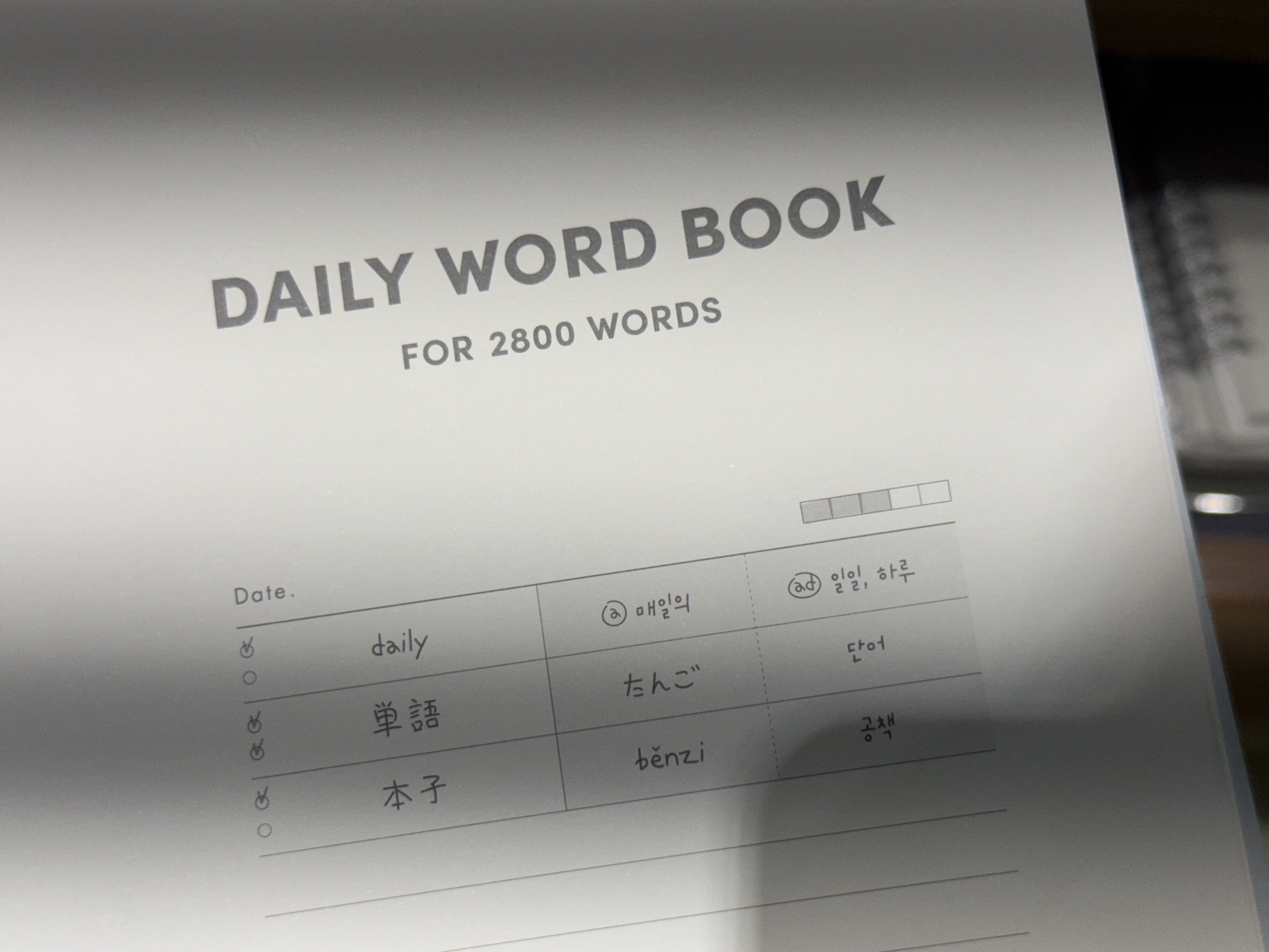우측 모서리부터 a / day / word / book 이라고 적혀 있다. 그리고 10개씩 100일간 100개씩 외울 것을 권장하는 문구도 적혀 있다. 참고로 이 단어장은 아르디움 제품이 아니고 테이블 톡(Table talk)이라는 브랜드 꺼다.