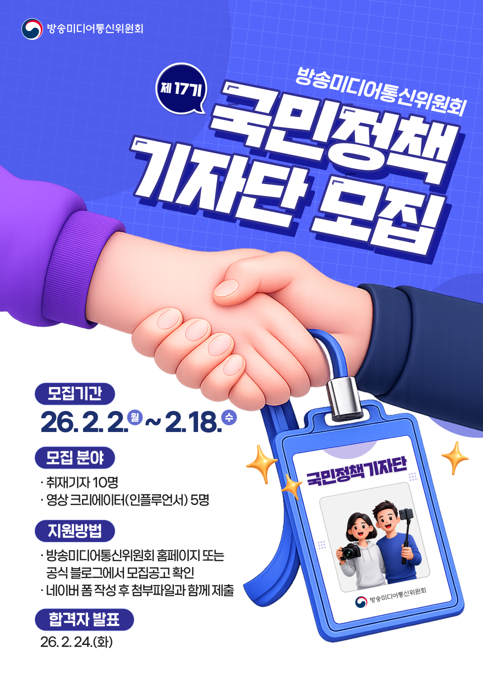 전 방통위(방송통신위원회)에서 이름을 바꾼 방미위(방송통신미디어통신위원회)에서 국민정책기자단을 모집합니다. 방송, 통신, 미디어 분야에 관심있는 국민이라면 누구나 지원할 수 있어요. 취재기자 및 영상 크리에이터 두 분야로 선발합니다. 자세한 내용은 아래 본문을 참고해보시고 관심 있으시다면 적극 지원해보세요.