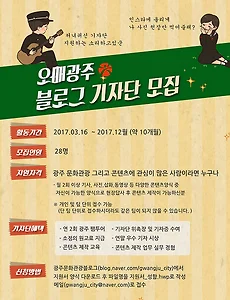 관광4 MBC경남 라디오 방송 클릭오늘 통영여행 인터뷰 지난 주부터 통영여행 기자단으로 활동하고 있는데요. 통영시청 관광마케팅과 천 선생님의 추천으로 MBC 경남 라디오 발송 과 인터뷰를 하게 됐습니다. 은 평일 18:10~19:00까지 약 50분 동안 퇴근길에 방송하는 정보 중심의 프로그램이라고 합니다. 아래 주소를 클릭하여 다시듣기 메뉴로 들어가면 아마도 인터뷰 내용을 육성으로 들어보실 수 있을 거에요. 경남 지역에 살고계신 분은 퇴근길에 라디오 생방송 을 들어보세요. * MBC경남 http://www.mbcgn.kr/cafe/?id=342 라디오 인터뷰는 이미 두 번이나 해봤지만 생방송은 역시나 떨리더라고요. 그럼에도 불구하고 작가분과 라디오 진행자분이 도와주셔서 떨지 않고 무사히(?) 인터뷰를 마칠 수 있었습니다. 특정 지역의 관광 SNS 기자단으로 .. 2017. 3. 15. 2017 오매광주 관광블로그 소셜 기자단 모집 광주의 관광자원을 홍보하는 오매광주에서 소셜 기자단을 모집한다는 소식입니다. 광주 문화관광, 콘텐츠에 관심이 있는 사람이라면 누구나 신청할 수 있어요. 28명으로 구성된 기자단에게는 연 2회 광주 팸투어, 원고료 지급, 콘텐츠 제작 전문교육 등의 혜택이 제공된다고 합니다. 먹거리도 많고 인심도 후한 도시 광주! 오매광주 소셜 기자단에 지원해보세요. :) * 광주광역시 소셜 기자단 지원하기 http://blog.naver.com/gwangju_city/220948977657 2017. 3. 15. 통영여행 기자단 발대식에 다녀와서 이번 주 금요일 통영시청에서 통영여행 기자단 발대식이 열렸습니다. 서울에서 통영까지는 4시간 10분이 소요되기 때문에 1시 10분 시작 시간에 맞춰 이른 시간에 집을 나서야 했죠. 통영- 하면 어떤 것들이 떠오르시나요? 저는 바다, 블루마운틴 카페(블로그 이웃 도깨비섬님이 운영하는 카페), 보성이(군대 동기)가 떠오릅니다. 통영은 저에게 '보고싶은 사람들이 있는 살고있는 도시'입니다. 한 마디로 정이 가는 곳이에요. 통영은 기라성 같은 문인들이 살았던 문화의 도시이기도 합니다. 박경리, 김춘수, 유치환, 윤이상, 전혁림 등 문화예술 분야의 선구자들이 통영에서 작품활동을 펼쳤기 때문이에요. 문학, 음악, 예술을 너무나도 애정하는 사람으로서 통영여행 기자단 선발은 영광 그 자체였죠. 뜨거웠던(?) 발대식 현.. 2017. 3. 12. 한국관광공사 SNS 취재단 다님 1기 모집 여행을 좋아하는 SNS 이용자라면 주목~! 한국관광공사에서 SNS 취재단 다님 1기를 모집하고 있습니다. '트래블로거'라는 이름의 기자단이 이름을 바꿔 '다님'으로 새롭게 태어났다고 해요. 여행에 관심이 있는 분, 그리고 월 1회 기획회의 참석이 가능한 사람이라면 누구나 신청할 수 있어요. 선발된 다님 취재단에게는 미션 수행료 제공, 지자체 팸투어 기회 제공, 우수 취재단 시상, 한국관광공사 대한민국 구석구석 홈페이지 및 SNS 채널에 콘텐츠 게시 등의 혜택이 제공됩니다. 여행을 좋아한다면 지원해보세요! :) * 한국관광공사 SNS 취재단 다님 1기 지원하기 http://blog.naver.com/korea_diary/220949146164 2017. 3. 7. 이전 1 다음