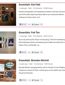 패션 마니아를 위한 소장품 인증샷 컬렉션 Hypebeast Essentials 디지털 패션 전문지 Hypebeast에서 자신의 소장품을 인증하는 Essentials를 만나볼 수 있다. 타인의 취향을 엿보는 재미가 쏠쏠하다. 인증샷을 올린 이의 실명, 직업을 비롯 간단한 소개문을 볼 수 있다. 또 사진에 나와있는 소장품에 마우스를 올리면 상품명을 알수 있다. 오프라인 패션지에서 착안한 아이디어가 기발하다. 나만의 Essential을 만들고 블로그 친구들과 릴레이를 해 보는 것도 재미있을 법 하다. Hypebeast Essentials http://hypebeast.com/tags/essentials/ Karl Hab이라는 포토그래퍼의 Essential 이다. 우리나라에서도 선풍적인 인기를 끌었던 운동화 루나글라이드가 보인다. 개인적인 취향의 문제이겠지만 루나글라이드를 남자가 신었을 .. 2012. 1. 13.