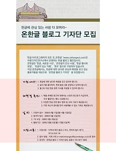 블로그 기자단12 온한글에서 블로그 기자단을 모집합니다. 윤디자인연구소에서 운영하는 블로그 온한글에서 블로그 기자단을 모집합니다. 한글에 대한 남다른 관심과 애정을 갖고 있는 블로거를 대상으로 한다고 해요. 월 2회 한글 관련기사를 작성할수 있어야 하며 현재 블로그를 운영하고 있어야 합니다. 최신의 폰트를 먼저 사용해볼수 있는 기회뿐만 아니라 한글 관련 행사와 교육의 기회가 제공됩니다. 원고에 대해서는 원고료를 주고 우수 활동자에게는 별도시상도 합니다. ☞ 온한글 블로그 기자단 지원하기 http://onhangeul.com/30067368160 온한글 블로그 기자단이 되서 좋은경험 해보시길 바랍니다. =) 2009. 9. 1. 기획재정부와 교육과학기술부 블로그 기자단 모집 기획재정부와 교육과학기술부에서 대학생 블로그 기자단을 모집중입니다. 대학생 시절로 돌아갈수 있다면 가장 하고싶은 일 중 하나가 블로그 기자단이나 블로그 관련 행사에 열심히 참석하는 일입니다. 전 온라인상에서의 활동을 시작으로 오프라인으로 연계해서 수익을 올리고 있지만 오프라인에서의 만남이 매우 중요하다고 생각합니다. 누군가는 그랬어요. 자신이 원하는 일이 있으면 그 일과 관련된 장소에 항상 모습을 드러내라고요. 대학생 블로그 기자단의 활동 혜택이 점점 좋아지고 있네요. 적극적인 지원과 활동으로 좋은 경험 쌓아가시길 바랍니다. ☞ 기획재정부 대학생 기자단 모집공고 바로가기 http://bluemarbles.tistory.com/372 ☞ 교육과학기술부 대학생 블로그 기자단 모집공고 http://blog.n.. 2009. 5. 1. 이전 1 2 3 다음