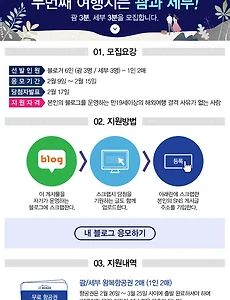 세부2 에어부산 괌 세부 여행블로거 원정대 모집 에어부산에서 취항지(괌, 세부) 여행기를 포스팅할 여행블로거를 모집하고 있습니다. 다음 주 수요일까지 신청을 통해 선발한 총 6인(괌 3명, 세부 3명)의 블로거에게는 왕복항공권이 주어집니다. 1인 2매가 지급되기 때문에 동반여행이 가능하다는 점이 매력적이군요. 여행 종료 후 포스팅 3개만 하면 된다고 하니 미션에 대한 부담도 덜한 편입니다. 해외 팸투어를 꿈꾸는 블로거라면 얼른 지원하세요! 블로거 원정대 신청하기 https://www.airbusan.com/content/common/flynjoy/event/event_20170209 2017. 2. 12. 티웨이항공 세부 티나는 여행단 7기 모집 티웨이항공이 티나는 여행단 7기를 모집하고 있습니다. 선발된 2인의 블로거는 2박 4일 일정으로 세부를 여행하고 돌아와 7개 이상의 여행후기 포스팅을 하게 됩니다. 왕복항공권(대구-세부) 1매, 경비 30만원을 지원하는 빵빵한 혜택 때문인지 벌써부터 경쟁이 치열하군요. 해외여행에 관심있는 독자분이라면 얼른 지원해보세요! 티나는 여행단 7기 지원하기 https://www.twayair.com/together/event/getEventInProgress.do?eventSeq=394 2016. 11. 18. 이전 1 다음