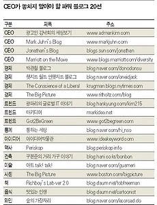 CEO 블로그5 CEO가 놓치지 말아야 할 파워블로그 20선 이웃블로그의 새글을 한RSS를 통해 확인하던중 CEO가 놓치지 말아야 할 파워 블로그 20선이라는 글을 보게 됐어요. MARK님, 마키디어님, 광파리님, 번뜩맨님 등 이웃 블로그가 많이 보여 참 반가웠습니다. 정말 축하드립니다. 블로거팁닷컴은 참고 사이트에 이름을 올렸네요. 안철수연구소 김홍선 CEO의 블로그가 빠져있다는게 아쉬워요. CEO분들께 추천합니다. 김홍선의 IT와 세상 바로가기 http://ceo.ahnlab.com/ ☞ 한경비즈니스 기사 원문 보기 http://www.kbizweek.com/article/view.asp?vol_no=708&art_no=40&sec_cd=1701 ☞ CEO가 놓치지 말아야 할 파워 블로그 20선 中 "CEO들이 놓치지 말아야 할 파워 블로그 20선"은 지금까지.. 2009. 6. 30. 기업블로그 사례, 안철수연구소 CEO 블로그 블로그 URL 김홍선의 IT와 세상 바로가기☞ http://ceo.ahnlab.com/ 블로그 SUMMARY 안철수연구소의 CEO 블로그가 생겼다는 것을 CEO 김홍선님의 트랙백을 보고야 알았다. 뒤늦은 리뷰지만 블로거팁닷컴 독자들에게 추천할만한 좋은 블로그라고 생각된다. CEO가 블로그 개설후 먼저 트랙백을 걸어온 것은 처음 있는 일이다. 개인적으로도 영광이고 기분좋은 일이지만 이런 작은 액션에서도 CEO의 열린 마인드를 엿볼수 있었다. 김홍선의 IT와 세상 블로그에서 IT 업계 CEO의 경험과 노하우를 통해 피가되고 살이되는 인사이트를 얻을수 있을 것이다. 블로그 REVIEW ☞ 블루 색상의의 타이틀 이미지는 젊은 기업의 CEO 느낌을 제대로 살렸다는 생각이다. 역시 IT업계 CEO라 그런지 뭔가 다.. 2009. 4. 9. 놓쳐서는 안될 CEO 블로그 TOP11 CEO가 블로그로 효과를 보기 위해서 생각해보아야 할 것들을 마케팅 구루 세스고딘은 이렇게 말하고 있군요. CEO가 블로그를 만들면 보통 자신의 취미생활 등 사적인 포스트나 회사의 비즈니스적인 부분에 대한 이야기를 늘어놓는 편입니다. 자신이 직접 블로그를 운영하기도 하지만 블로그 담당자를 따로 두는 경우도 있습니다. 해외, 그리고 국내의 CEO 블로그 중에서 볼만한 곳 10개만 모아서 정리해 봤습니다. 상단의 CEO 이미지는 아래에 소개된 CEO 블로그의 주인들, CEO(최고경영자)들의 이미지입니다. 주소를 클릭하면 새 창으로 열립니다. :-) 1. 전명헌 (전 에델만코리아 회장, 전 현대종합상사 사장) http://www.markjuhn.com/ 2. 김낙회 (제일기획 CEO) http://admank.. 2008. 10. 5. 기업블로그 사례, Scott Ragsdale 블로그 URL Scott Ragsdale 블로그 바로가기☞ http://www.scottragsdale.com/ 블로그 SUMMARY Naseba라는 글로벌 비즈니스 회사의 CEO 블로그입니다. 솔직한 글솜씨가 일품이네요. 검정 구찌 로퍼(구두)라는 포스트의 도입부분을 보면 "My marketing team asked me to repost this entry because they told me this is a popular “key word” on google for my blog." 이라고 되어있어요. 해석해보면 "마케팅팀에서 이 포스트를 다시 한번 포스팅하라고 요청했는데 그 이유인 즉 구글에서 유명한 키워드여서랍니다." 라고 적어놨어요. 우리나라도 좋은 CEO블로그가 이쯤에서 하나 나올만한데 말.. 2008. 6. 6. 기업블로그 자료, 월스트리트 저널에 소개된 CEO 블로그 목록 월스트리트 저널의 Marketbeat 코너 직원이 올린 글입니다. 썬마이크로 시스템즈 뿐 아니라 메리엇 인터네셔널 등 다른 CEO들의 블로그도 링크되어 있는 포스트입니다. CEO 블로그에 관심이 있으신분은 봐두시거나 북마크 해두시면 좋은 자료가 될 것입니다. 기업 블로그 관련 콘텐츠는 블로거팁 닷컴 구독을 통해 계속해서 받아보실수 있습니다. 블로거팁 닷컴 RSS주소☞ http://feeds.feedburner.com/bloggerztip ☞ 해당 포스트로 접속합니다. http://blogs.wsj.com/marketbeat/2007/07/12/the-ceo-blogs/ CEO 들의 이름과 블로그 이름, 기업 정보가 간략히 소개되어 있습니다. 참고 바랍니다. ♡ 포스팅이 유익 하셨다면 블로거팁 닷컴을 구독.. 2008. 3. 14. 이전 1 다음