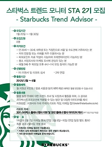 스타벅스 트렌드 모니터 STA 2기 모집 세계적인 커피 브랜드 스타벅스가 대학생 및 직장인을 대상으로 트렌드 모니터를 모집하고 있다. '파워포인트 자료 작성이 가능하고 프레젠테이션이 가능한 분' 이라는 자격요건의 한 줄이 걸리지만 남다른 경험이 될 것 같다. 월 지원금 10만원과 음료 시음권 등의 혜택도 제공된다. 필자도 약 4년전 두산매거진 GQ의 모니터링 요원으로 활동했는데 네트워킹에 도움이 됐다. 트렌드 모니터 모집 페이지 바로가기 http://www.istarbucks.co.kr/Whats_new/notice_view.asp?Seq=1492 2012. 1. 24.