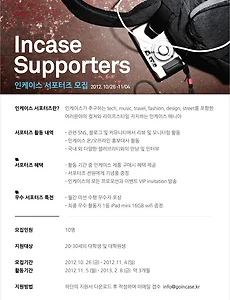 incase2 인케이스 코리아 SNS 서포터즈 모집 노트북 가방, 카메라 가방, 휴대폰 케이스 등을 제작하는 인케이스 코리아에서 SNS 서포터즈를 모집하고 있습니다. 11월 4일까지 인케이스 마니아를 대상으로 서포터즈를 모집한다고 합니다. 인케이스라는 브랜드를 좋아하는 대학(원)생이라면 지원해보세요. 인케이스 서포터즈 모집 페이지 http://is.gd/ce05B4 2012. 10. 29. 인케이스 카메라 가방 Sling Pack for DSLR 리뷰 캐논의 DSLR 600D를 사면서 캐논 정품 가방을 받았습니다. 수납공간도 넉넉하고 사용하기에는 무리가 없었지만 투박해서 들고 다니기가 참 애매했어요. 남방, 자켓류를 즐겨입는 저에겐 어울리지 않는 디자인이었다고 할까요. 또 자전거를 탈때 카메라 가방을 메고 탔더니 허벅지가 가방에 닿아 불편했어요. 결국 실용적이면서도 예쁜 카메라 가방을 찾으려 인터넷을 뒤지기 시작했어요. 그러다 제 눈에 쏙 들어온 가방을 발견했는데 바로 인케이스의 DSLR 전용 가방 Sling Pack입니다. 해외 카메라 포럼에서도 유저들에게 좋은 반응을 얻고 있어 더 좋았습니다. 서울 인케이스 오프라인 매장은 모두 품절이어서 해외 인터넷 사이트에서 구매했습니다. 사실 인케이스라는 브랜드를 좋아하지는 않습니다. 왜냐하면 이전에 아이폰 .. 2012. 4. 11. 이전 1 다음